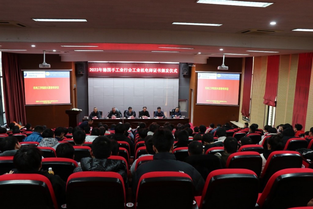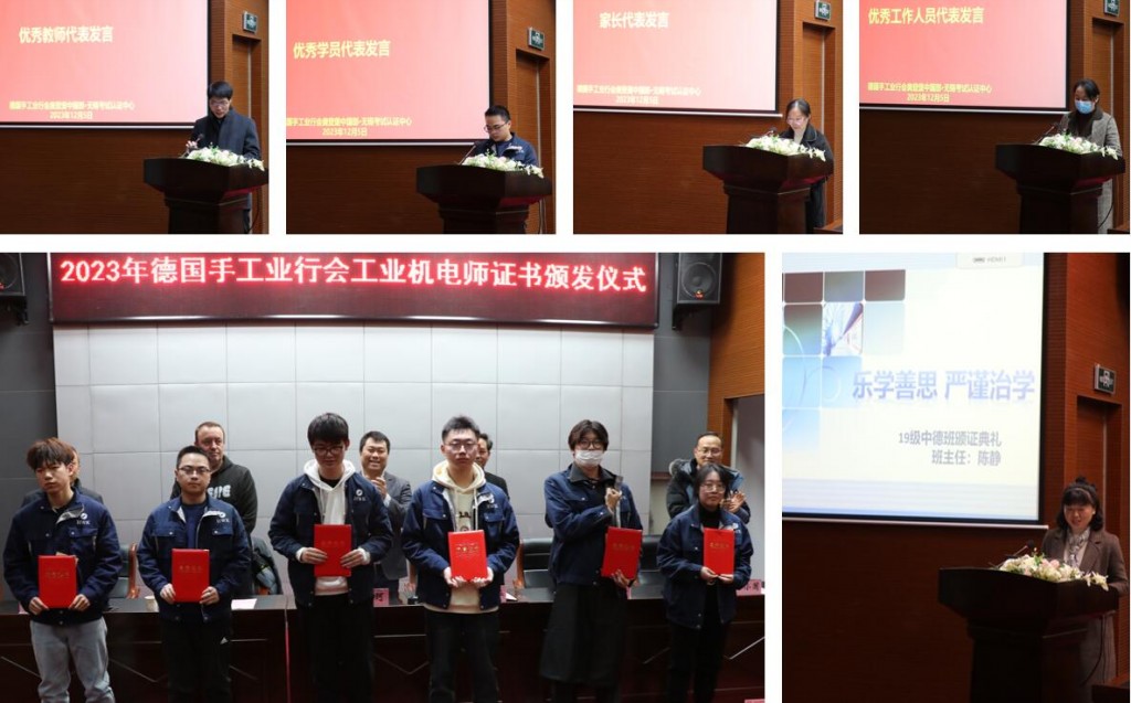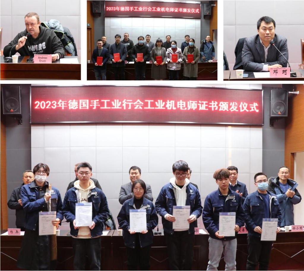 为总结中德班教学成果,表彰表现优异的学生、教师,激励更多中德班学生踔厉奋发,勇毅前行,12月5日,德国手工业行会中国项目办与学校联合举办了2023年德国手工业行会工业机电师证书颁发仪式。