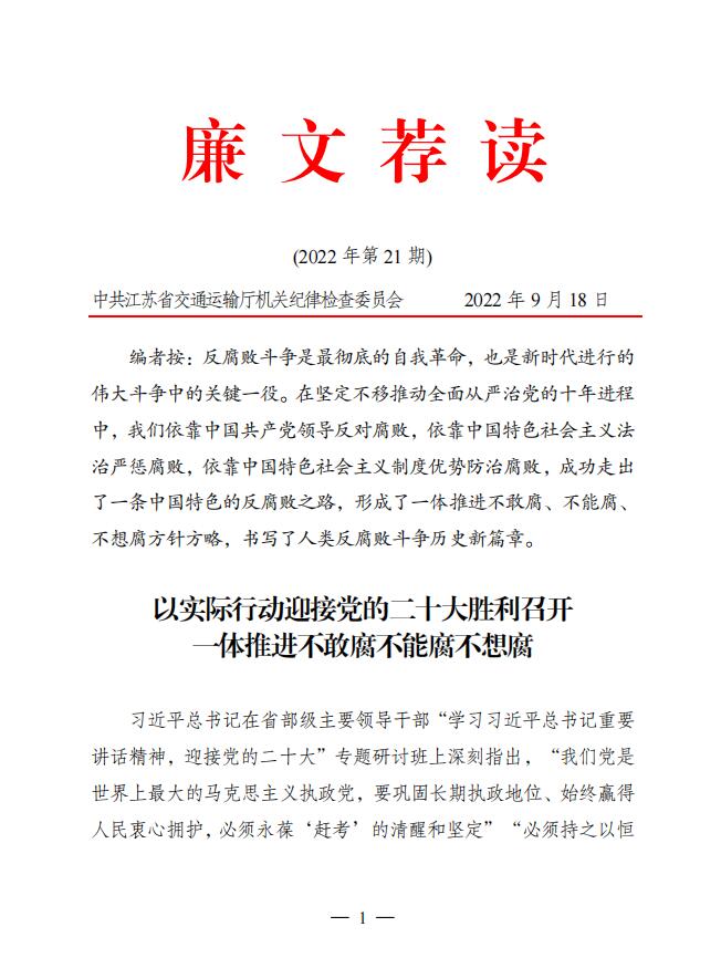 2022年廉文荐读第21期——以实际行动迎接党的二十大胜利召开 一体推进不敢腐不能腐不想腐