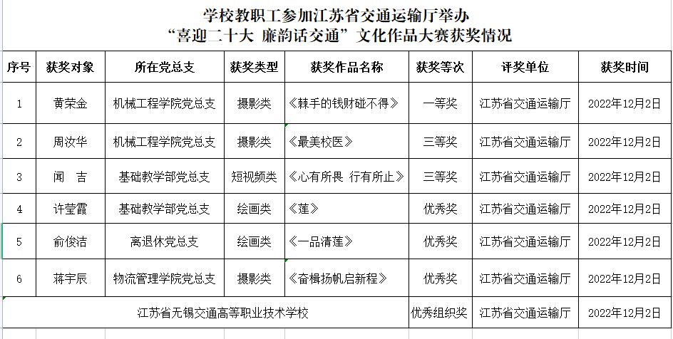 近日,江苏省交通运输厅通报了关于“喜迎二十大 廉韵话交通”文化作品大赛评选结果,学校在多个类目中获得优异成绩,黄荣金老师的摄影类作品《棘手的钱财碰不得》荣获一等奖,周汝华老师的摄影作品《最美校医》荣获三等奖,闻吉老师的短视频作品《心有所畏 行有所止》荣获三等奖,许莹霞老师的绘画作品《莲》、俞俊洁老师的绘画作品《一品清莲》、蒋宇辰老师的摄影作品《奋楫扬帆启新程》分获优秀奖,学校在此次活动中被授予“优秀组织奖”。