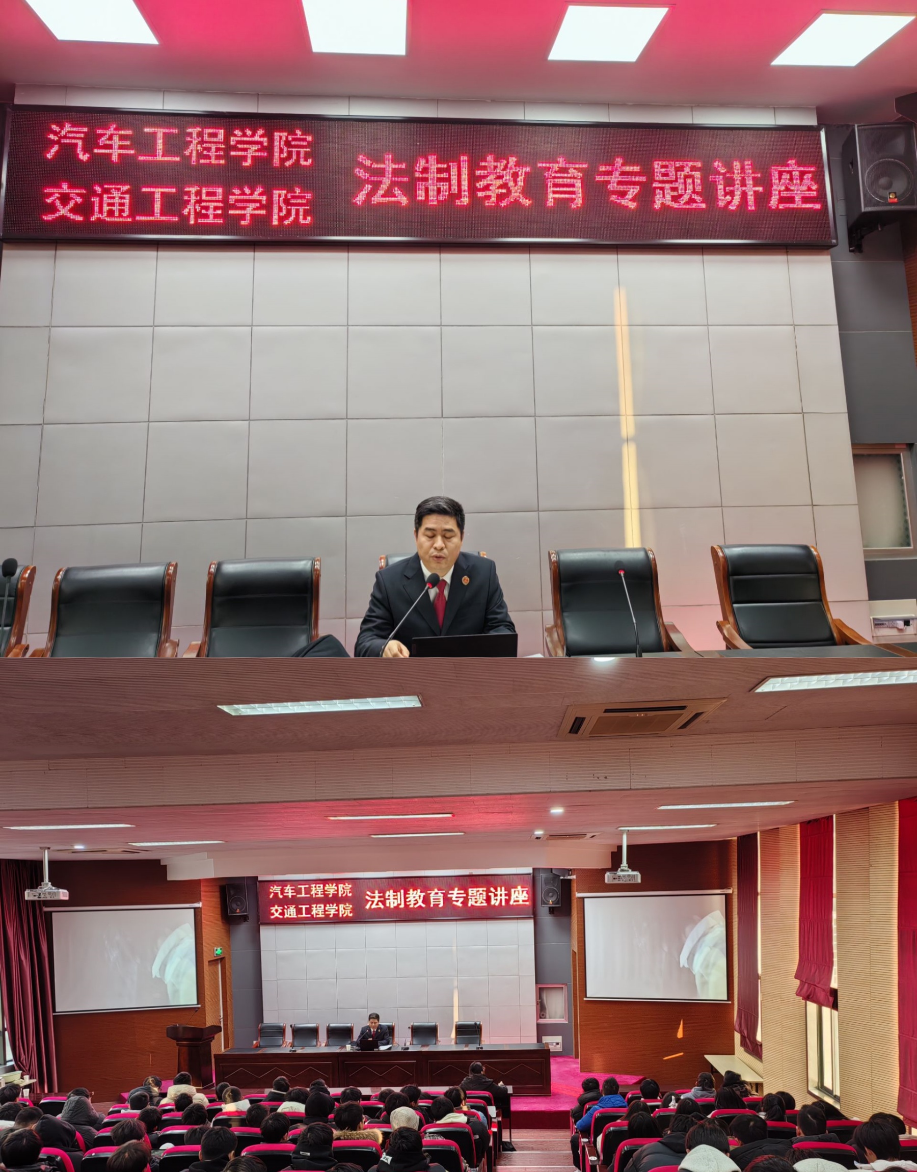 2023年12月21日交通工程学院与汽车工程学院联合举办法制教育专题讲座邀请无锡市滨湖区人民检察院党组成员、副检察长李玉涛为学生“学生欺凌法制教育”专题讲座。