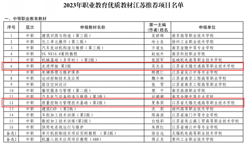 近日,省教育厅组织了2023年职业教育优质教材推荐申报工作,经专家评审、教育厅公示,全省有16部教材入选,其中我校船舶工程学院吴志亚教授主编的《走进焊接 第2版》和机电工程学院夏春荣教授主编的《质量控制与管理技术基础》2部教材入选2023年职业教育优质教材江苏推荐正选项目,取得教材建设新突破。