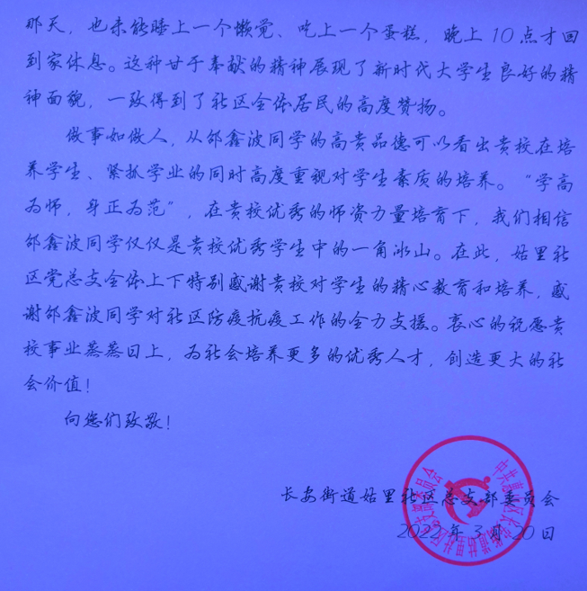 近日,无锡市长安街道姑里社区总支部委员会向我院发来一封感谢信,信中表示我院171211班邵鑫波同学积极响应政府号召,在专转本备考期间积极投入家乡防疫,主动参与志愿服务工作,为保障社区全体居民生命健康安全作出了突出贡献,充分体现了机械学子的细心和责任心。对该同学抗疫表现和学院的人才培养给予了肯定和赞扬!