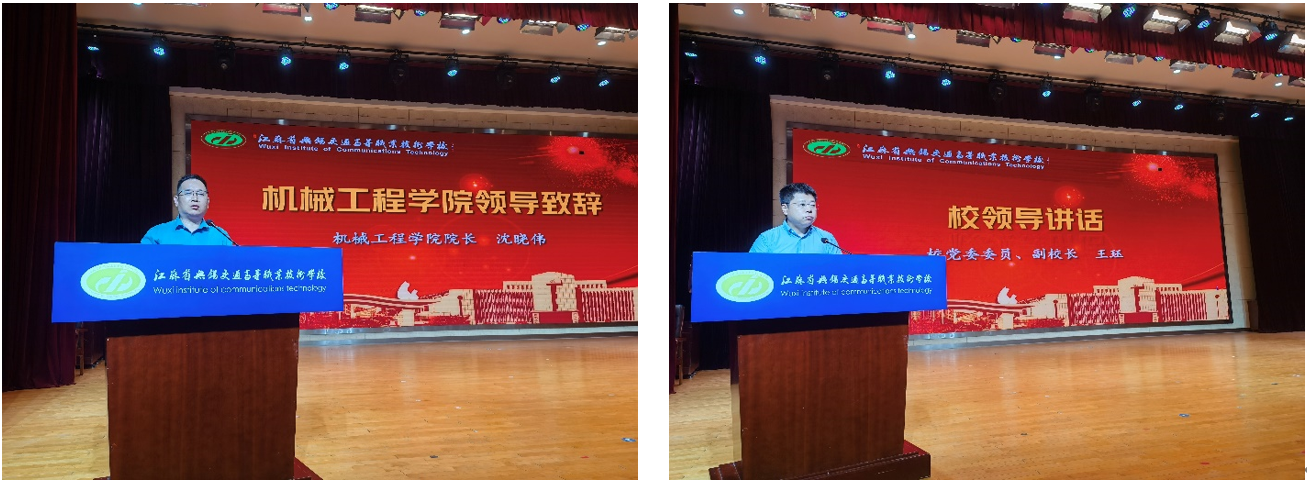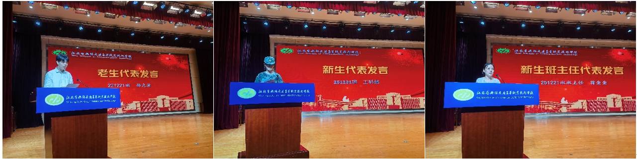邀请221221班学生杨光浩同学代表老生发言,杨光浩同学从自身的感受告诫学弟、学妹们要树立远大理想,坚定信念,锤炼技能。新生代表251231班王科然同学代表全体新生,怀揣着对未来的信心,明确了日后学习的目标,提出了新征程学习生涯的规划。251221班班主任蒋金金老师代表新生班主任发言,她说班主任是同学们前行的引路者,是同学们的大家长,希望和同学们一起走向成功。 接着机械工程学院院长进行了发言,沈院长从机械工程学院的发展历程,学院的现状进行了阐述,指引机械学子要“抓紧时间学知识,掌握技能求生存”。最后校党委委员,副校长王珏进行了致辞,王校长指出:无锡交校欢迎大家的到来,希望大家厚植爱党爱国爱校情怀,明确人生理想目标,传承拼搏奋进、勇创一流的职业精神,塑造人格、修为品德,展现新时代职校生的青春风采,在中国式现代化国家建设新征程中建功立业。