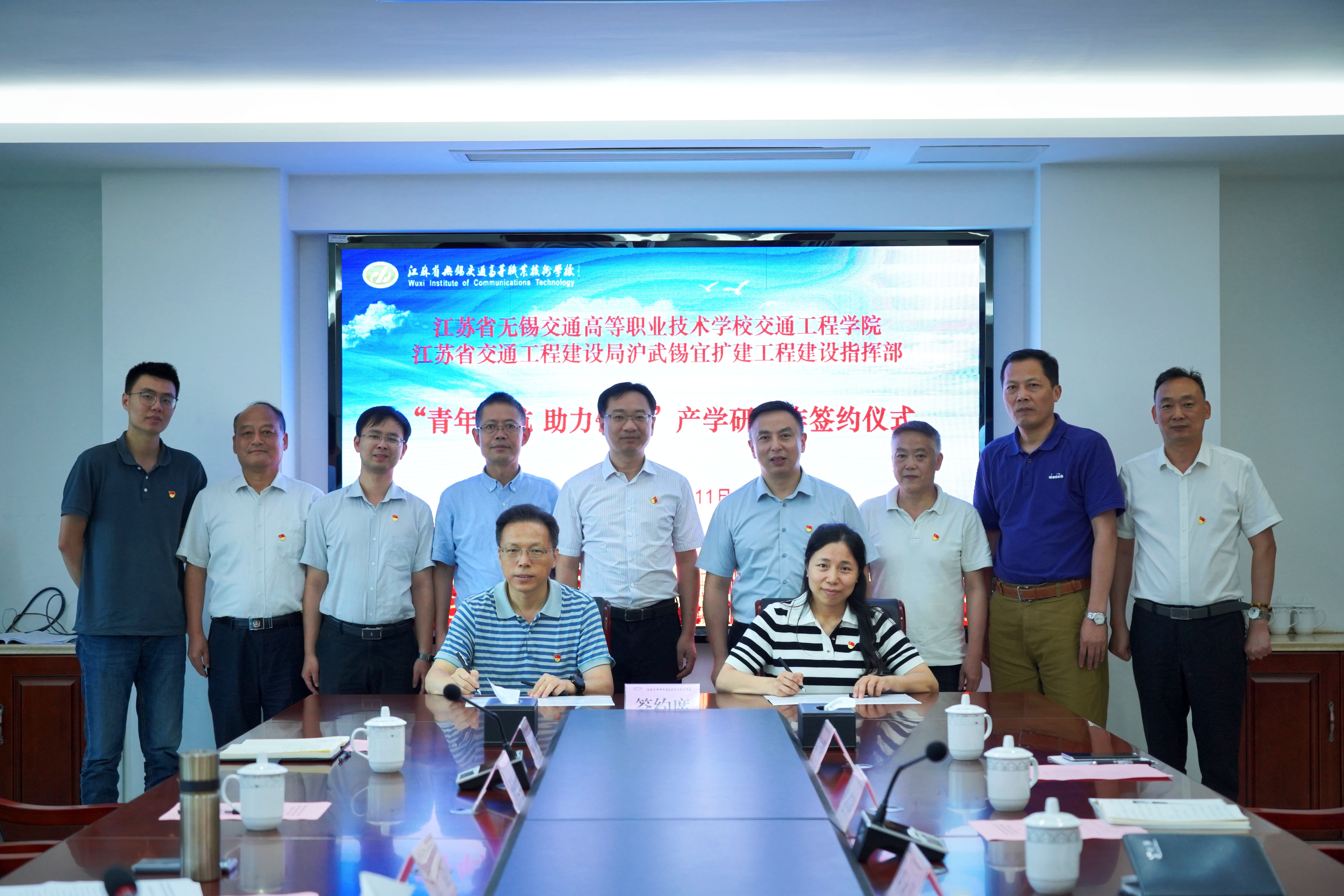 7月11日下午,学校交通工程学院与江苏省交通工程建设局沪武锡宜扩建工程建设指挥部在我校举行“青年启航 助力锡宜”产学研合作签约仪式。省交建局党组成员、副局长周进,省交建局沪武锡宜扩建工程建设指挥部总指挥江臣,副总指挥陈光伟、郭赵元,学校党委书记、校长李进,学校党委员、副校长吴雪琴出席签约仪式。仪式由学校党委书记、校长李进主持。
