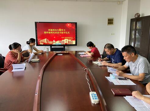 会议集中学习了教育部印发的《新时代高校教师职业行为十项准则》,“教育部关于建立健全高校师德建设长效机制的意见”,教育部等七部门印发《关于加强和改进新时代师德师风建设的意见》。会上张俊、刘星、胡北京三位老师进行了专题学习交流。会议组织全体教师签订了《师德师风承诺书》,全体教师从遵章守纪、爱岗敬业、关爱学生、为人师表、勇于创新、严谨治学、团结协作、廉洁从教等八个方面郑重承诺:积极履行岗位职责,塑造良好的师德师风形象,争做一名师德高尚的教育工作者。