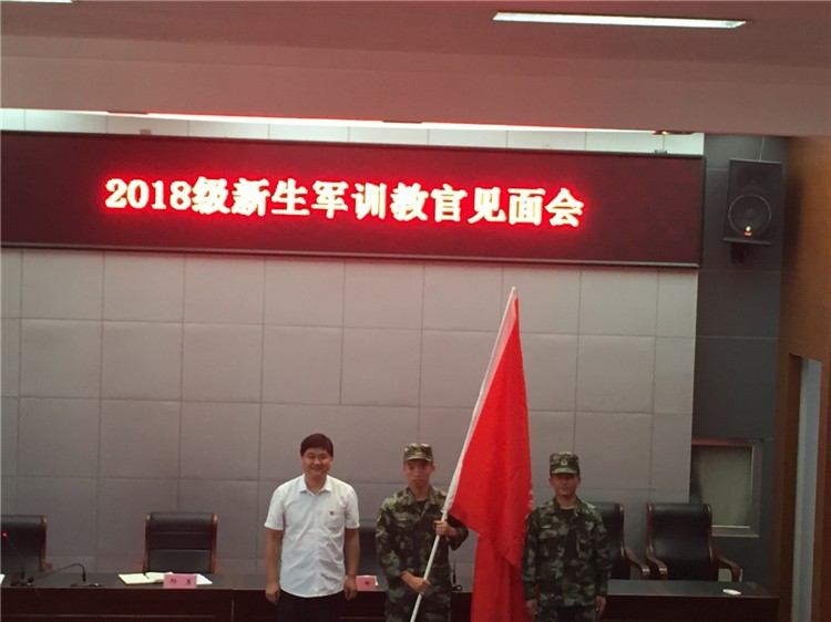 最后邢校长代表学校向李峰少校授军训团团旗,学校2018级新生军训正式拉开帷幕!