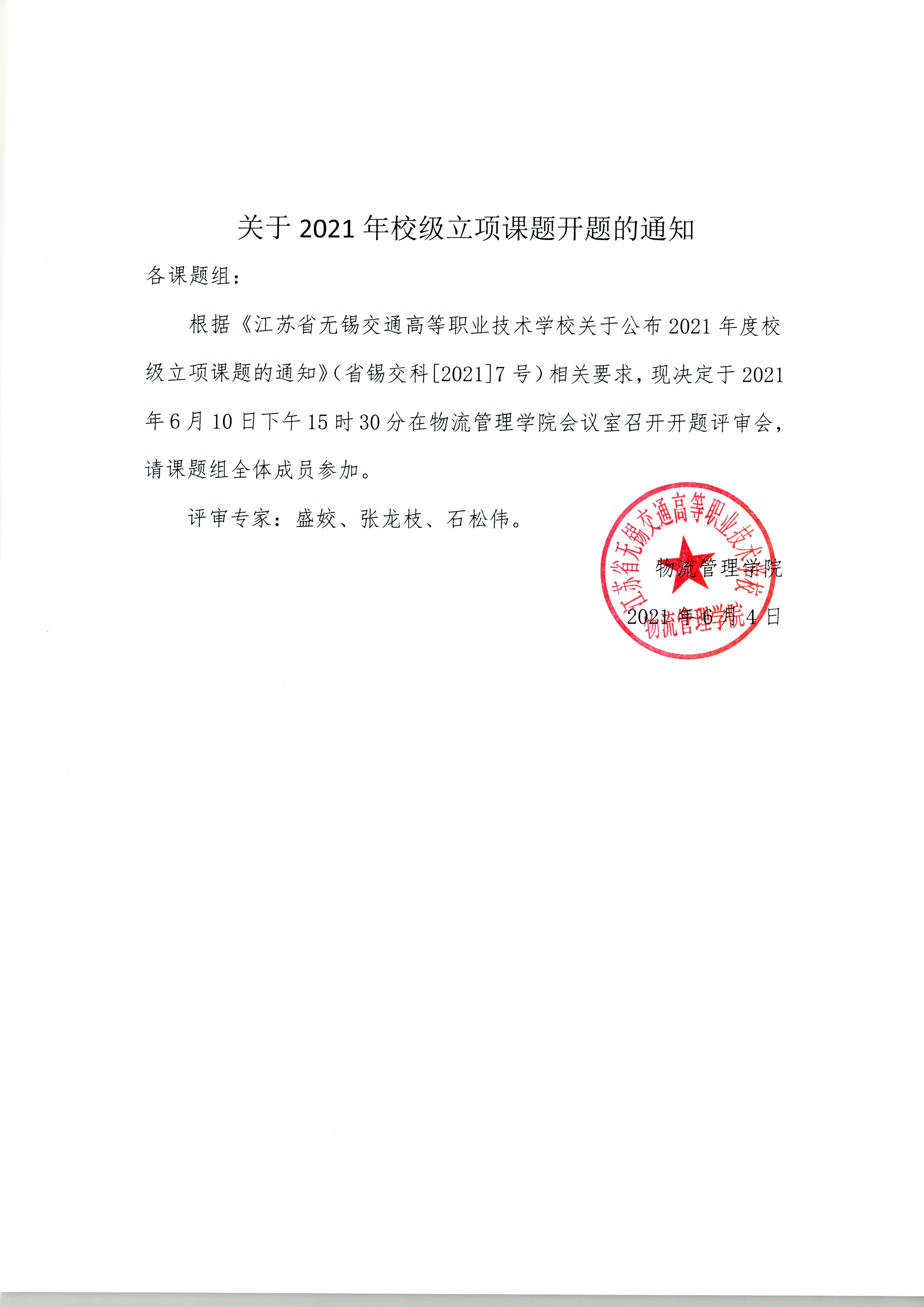 根据《开云手机客户端关于公布2021年度校级立项课题的通知》(省锡交科[2021]7号)相关要求,现决定于2021年6月10日下午15时30分在物流管理学院会议室召开开题评审会,请课题组全体成员参加。
