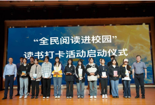 在“全民阅读进校园”读书打卡活动启动仪式上,范校长和徐正昌委员向学生代表赠书并合影留念,鼓励学生养成阅读习惯,提升知识储备。学生代表吴佳慧发言,表达了青年学子对阅读和法治学习的热情与决心。