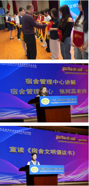 接着,对优秀宿舍及其舍长授予 “文明宿舍”、“优秀舍长” 称号,鼓励学生向榜样宿舍看齐。为进一步规范住宿生行为,邀请我校宿舍管理中心张珂蕊老师展示宿舍检查问题,并向师生展示《物流管理学院标准化规范化建设实施方案》,由学生会宣读《宿舍文明倡议书》,呼吁学生培养良好的行为习惯,共守规定、同营佳环境,会后学生在班主任带领下现场学习内务整理。