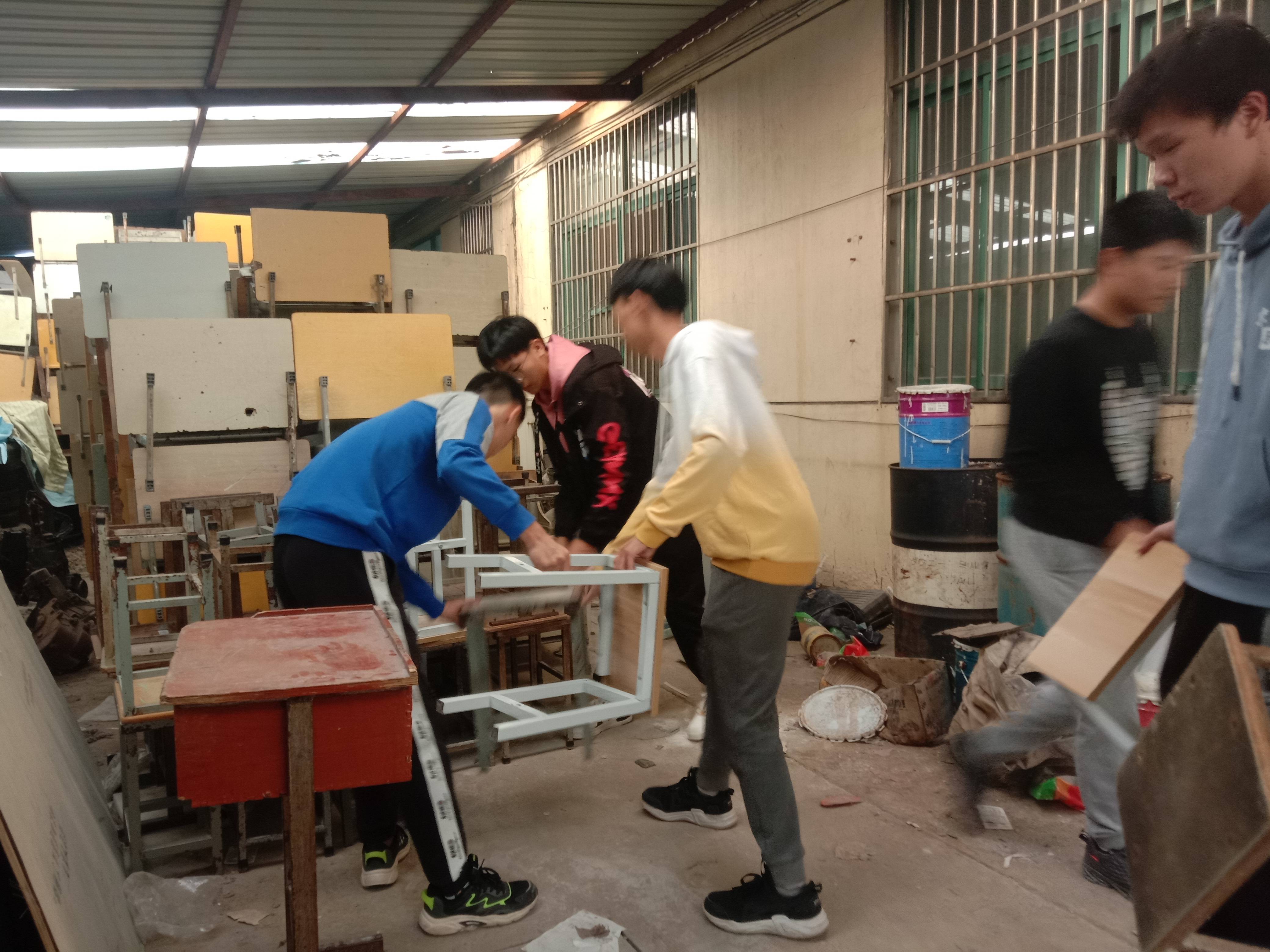 物流管理学院新学期教室搬迁后有一百多张桌椅更换剩余,经与资产管理处联系后需搬迁集中存放点。10月13日下午,学院召集每个班级男生帮忙搬运,每班男生数量虽少,但每个班级学生都自告奋勇热心帮忙搬运。因数量较多,学生来回几趟,不辞辛苦,齐心协力帮忙将桌椅全部搬运到位。通过此次搬运,在学生中进一步弘扬“奉献、友爱、互助、进步”的志愿精神。