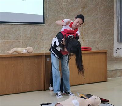 活动初始,红十字会培训老师向师生们介绍了红十字会的起源发展、工作职责、标志及“人道、博爱、奉献”的红十字会精神,使同学们对红十字会有了初步了解。随后,红十字会培训老师结合理论知识和实际救护技巧对生活中遇到突发状况急救、徒手心肺复苏、溺水紧急救护等内容作了详细的讲解。为了使师生们更加深入的了解各项救护技巧、掌握心肺复苏要领、培训老师和师生们在现场展开了深入互动,对心肺复苏进行了实操演练、手把手向同学们传授了急救手法和注意事项。
