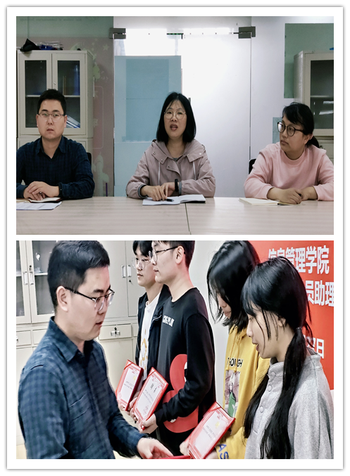 4月27日中午12点30分,信息管理学院学生专(兼)职辅导员助理聘任仪式在信息管理学院三楼会议室举行。信息管理学院副院长蒋红梅、团总支书记朱沛、团总支组织委员王得雪、专职辅导员祝胜菁及相关学生干部参与仪式。仪式由朱沛老师主持。