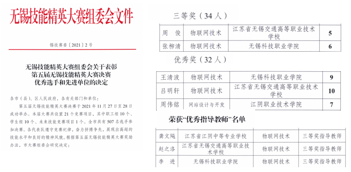 2021年11月27日至28日,第五届无锡技能精英大赛决赛在无锡职业技术学院成功举办。信息管理学院技能大赛师生团队代表学校参加物联网技术项目组的比赛。最终,周俊同学获得学生组三等奖、吕明轩同学获得学生组优秀奖,赵之洛老师被授予“优秀指导教师”荣誉称号。两名参赛同学均被核发相应的高级工职业技能等级证书。