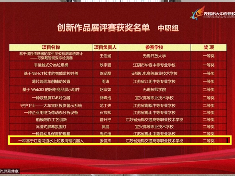 “创响无锡”2021年无锡市大中专院校创新创业大赛自2021年6月启动以来,学院积极响应,师生踊跃参赛。经过层层选拔和激烈角逐,许多优秀项目或个人在大赛中崭露头角,获得各项创业专项赛荣誉。在创新作品展评赛中,信息管理学院的《一种基于江南河道水上垃圾清理机器人》获二等奖,项目负责人211612班张俊杰同学在余老师的精心指导下,克服困难,刻苦训练,不断提高自身。在大赛中,张俊杰同学激情满怀,充分展现了学院学子在创新创业过程中的所见、所闻、所思、所悟,表达了学院学子传承工商精神,推进创新创业的决心和勇气。