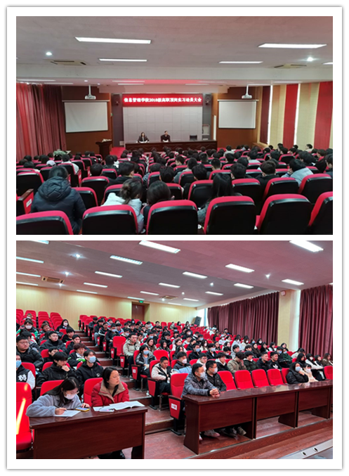 2023年2月27日上午10点,信息管理学院在学校学术报告厅召开2018级高职顶岗实习动员大会,学院领导班子、各教研室主任、专(兼)职辅导员、顶岗实习指导老师代表、全体2018级高职学生参加了动员会,动员会由学院院长郑智飞老师主持。