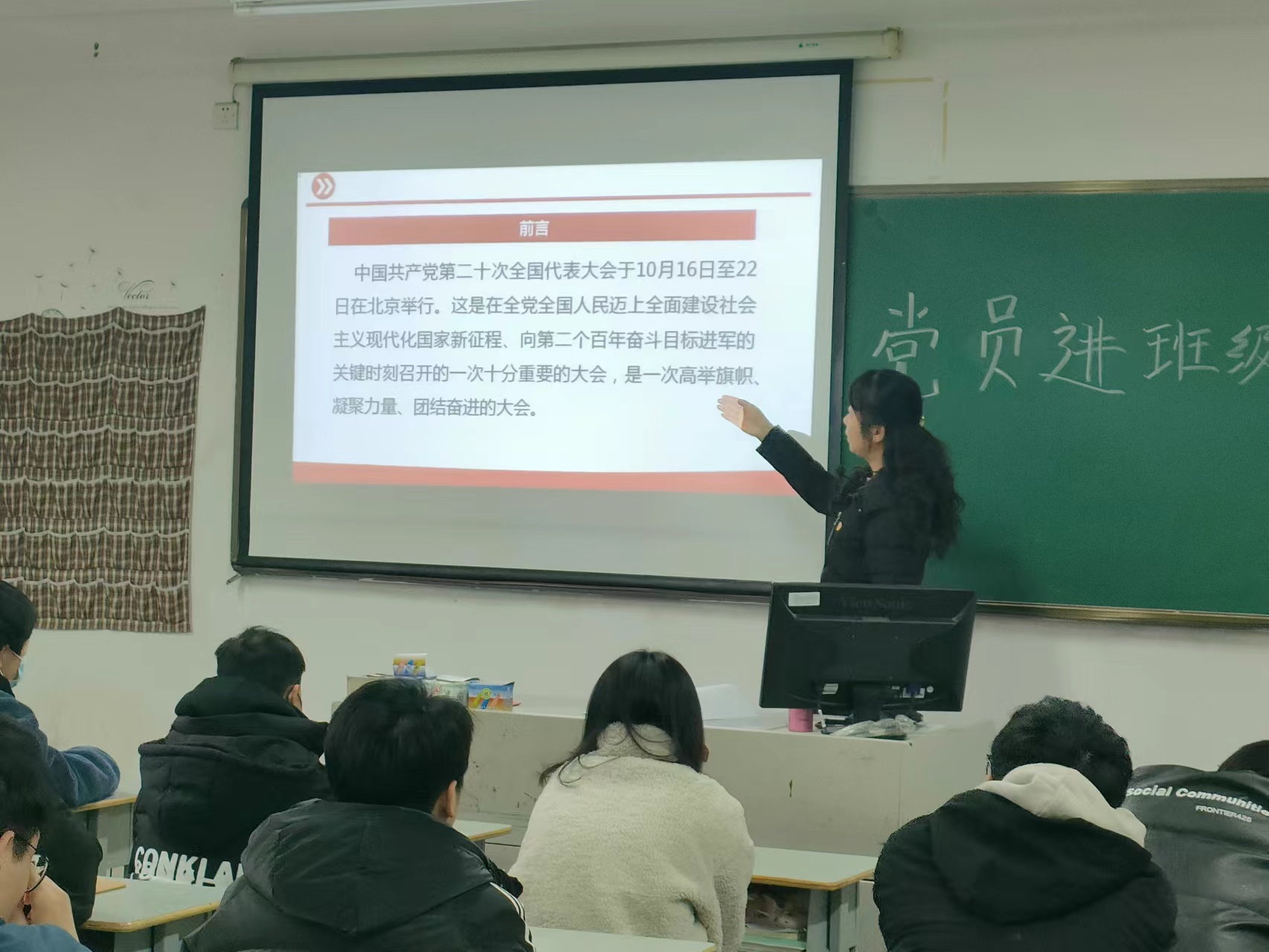 随后,邵敏珠介绍了党的二十大盛况和党的二十大报告主要精神,重点围绕党的二十大报告主题、主要成果等方面做了介绍,同时分享了自己学习党的二十大精神的感悟,内容生动丰富、语言通俗易懂,使全班学生对党的二十大精神有了更加全面、更加深入的认识和把握。