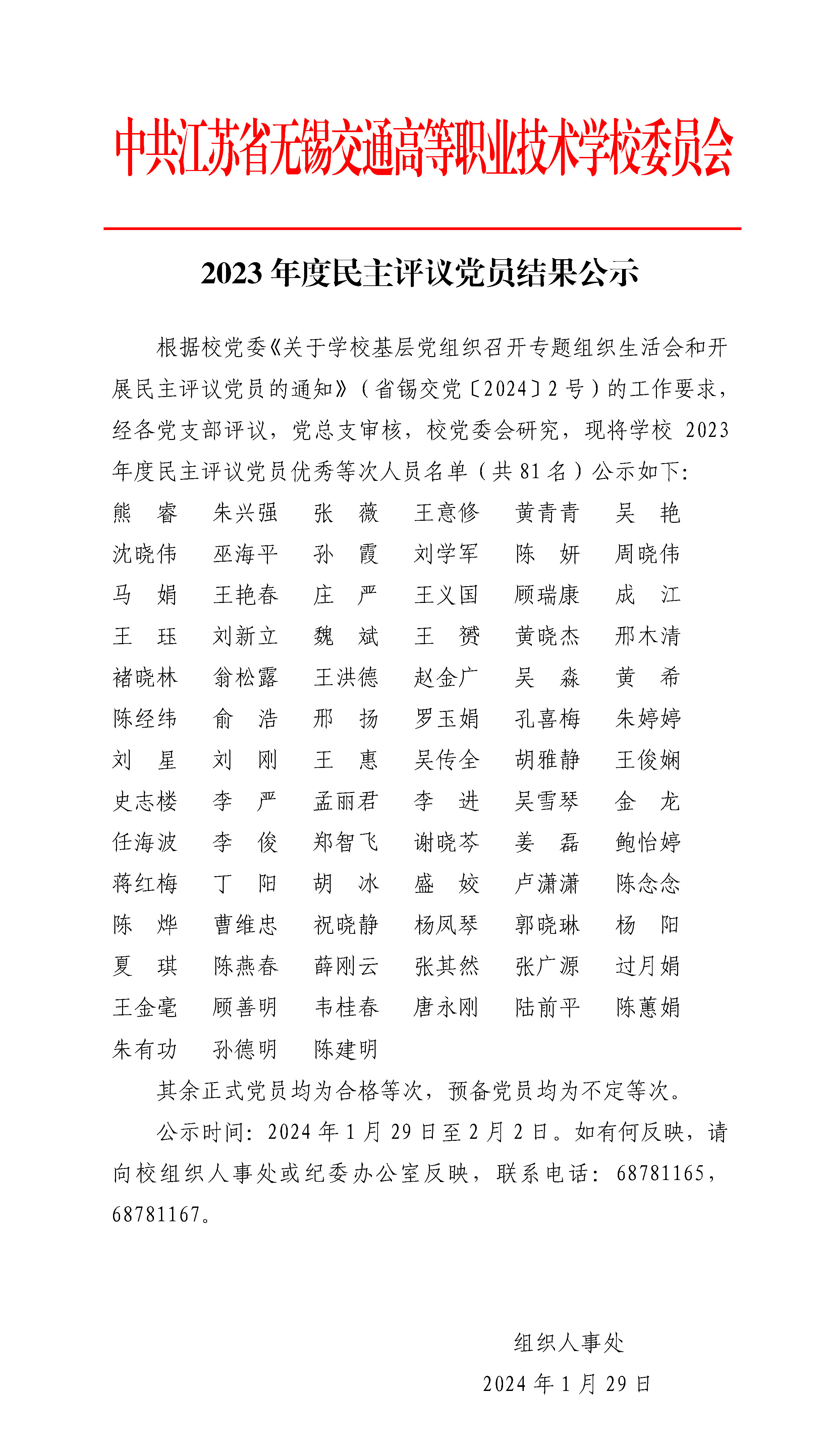 2023年度民主评议党员结果公示